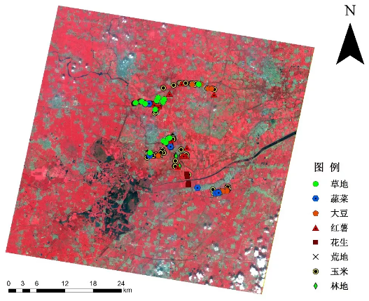 本次的案例我們采用“珠海一號”高光譜衛(wèi)星OHS-2(貴陽一號)的影像——河北雄安新區(qū),作為實驗區(qū)域。高光譜遙感影像數據經過輻射定標,并在定標結果的基礎上進行了FLAASH大氣校正。為了實驗的準確性,我們還對研究區(qū)域進行實地調查,調查樣點如圖1所示。
