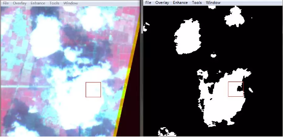 從圖1的“珠海一號”高光譜遙感衛(wèi)星影像中可以看到,研究區(qū)域的東南區(qū)域存在部分云量,在分類之前需要先將云掩膜去除。云的光譜特征曲線如圖2所示,云的反射率在480nm~866nm之間具有較高的值,而在紅光范圍內640nm附近處于相對較低的反射率。根據這一特點,將云提取出來。結果如圖3所示。