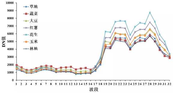 我們將實地提取的農作物進行分析得出平均光譜,如下圖所示,將農作物分為玉米、紅薯、大豆、花生、蔬菜、草地、林地、其他植被和非植被(水體、建筑、裸地和道路)。
