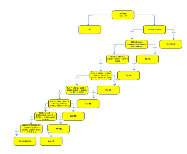 (2)根據圖(4)各地物光譜以及NDVI特征構建分類決策樹進行農作物分類,決策樹如下圖(5)所示: