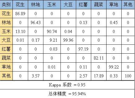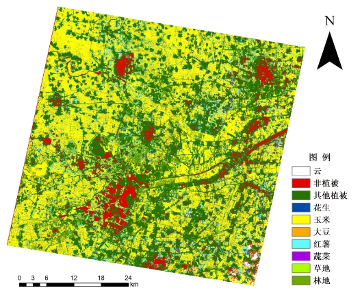 實驗利用“珠海一號”高光譜遙感衛(wèi)星影像數據,結合實地調查樣點,基于決策樹分類方法,對研究區(qū)土地覆蓋類型進行分類,利用驗證樣點基于混淆矩陣并利用實測點對分類結果進行精度驗證Kappa系數為0.95,總體精度達95.94%,精度評價結果如下表1所示,其中花生、玉米、大豆、紅薯、蔬菜具有較高的分類精度,花生和玉米存在小部分混分,由于遙感影像不可避免會存在“同譜異物”現象,導致蔬菜和其他植被存在混分現象。